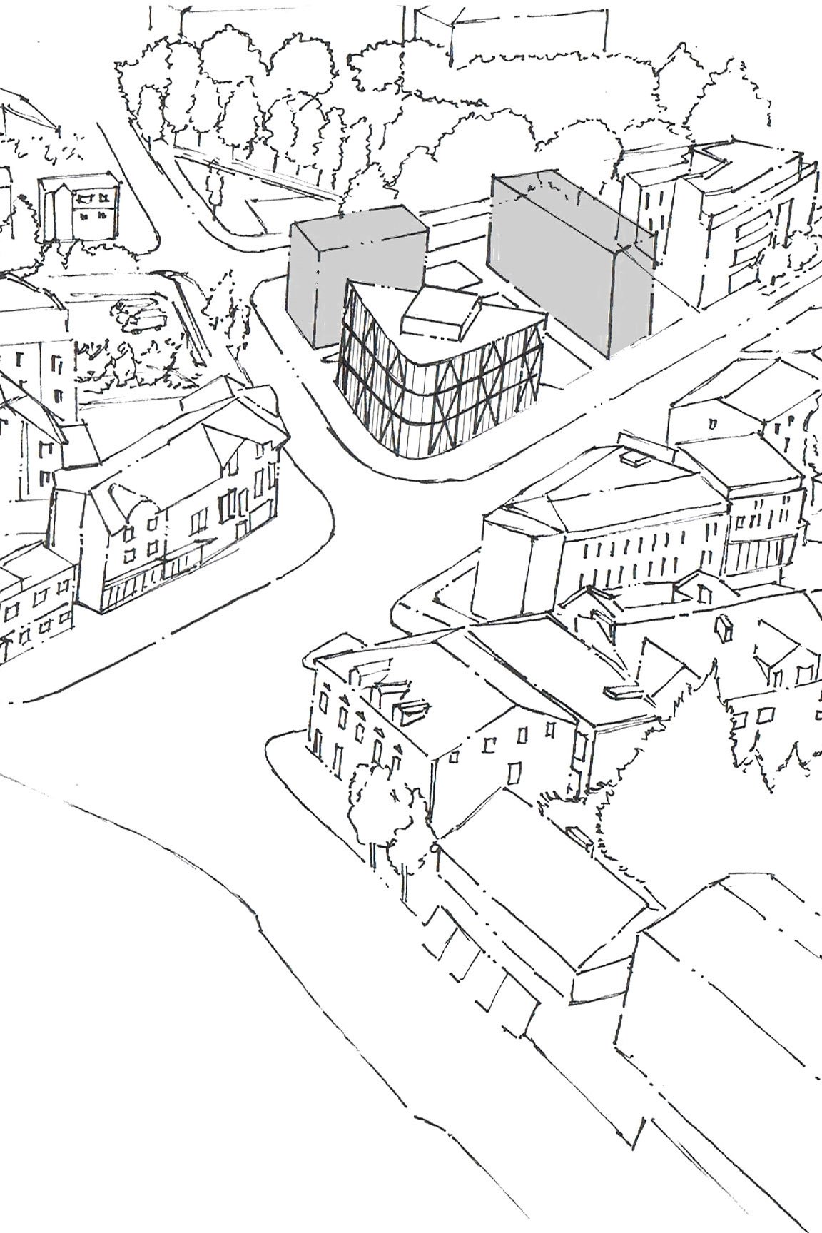 The building design proposes an extension that harmoniously blends with the surrounding architecture, maintaining the compact nature and overall harmony of the area. The primary entrance of the cinema is strategically positioned at the corner, directly facing the street intersection, creating an inviting and accessible point of entry.