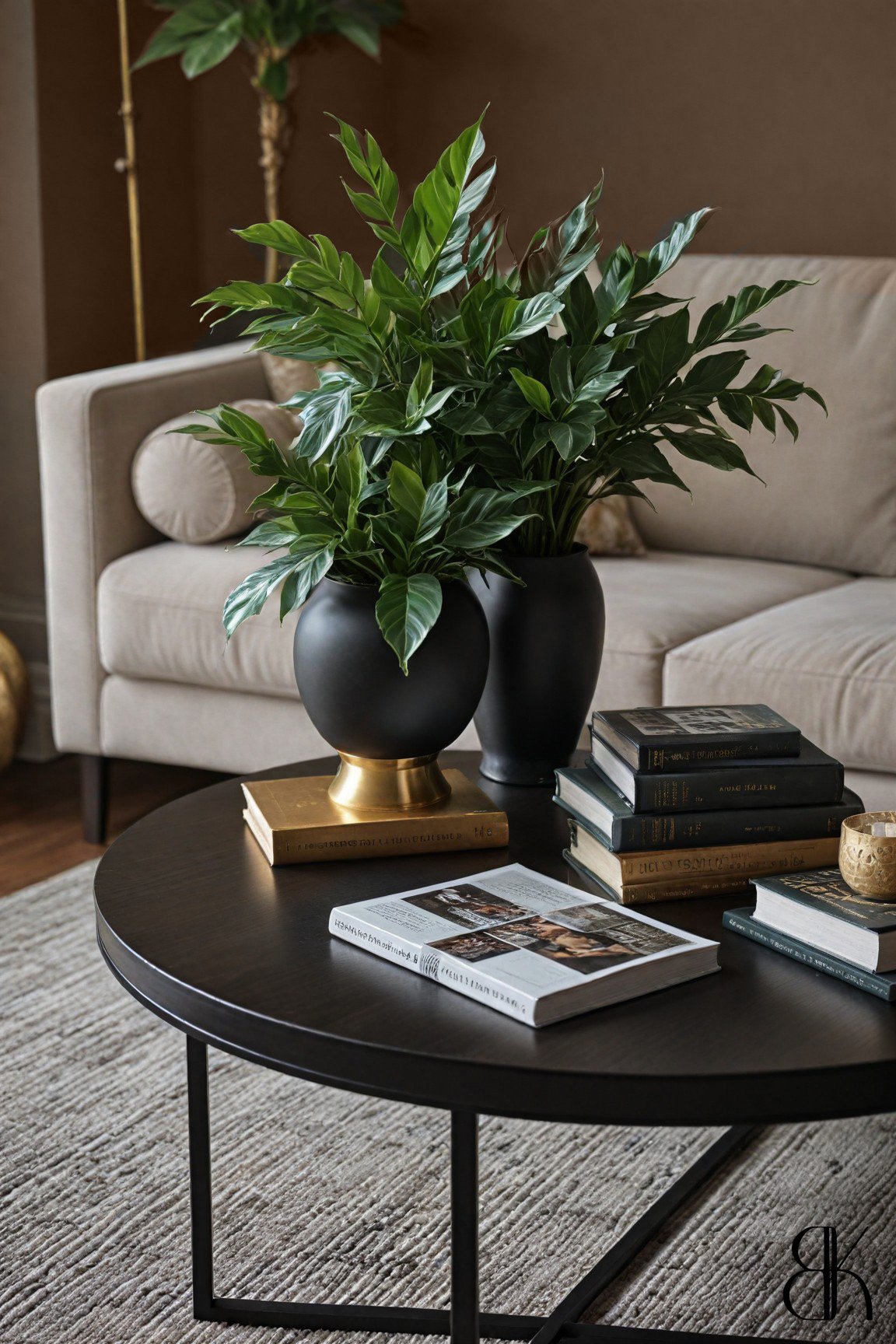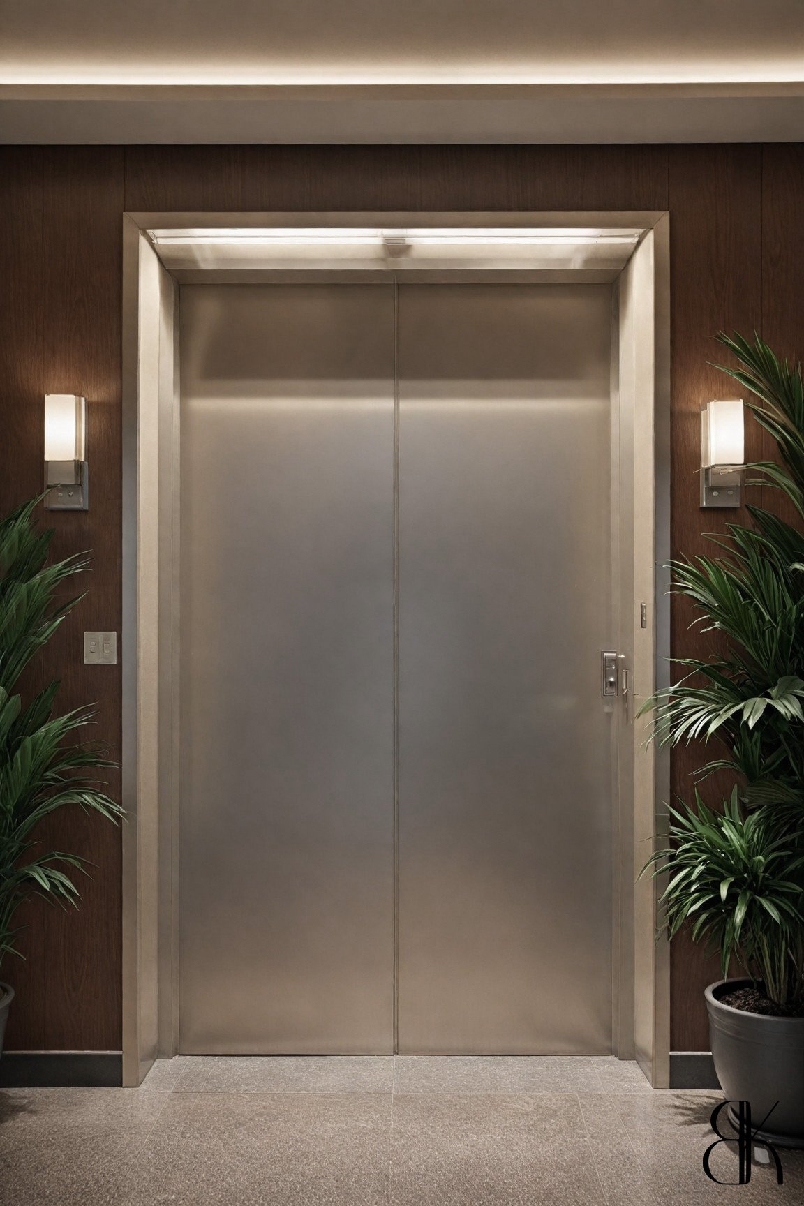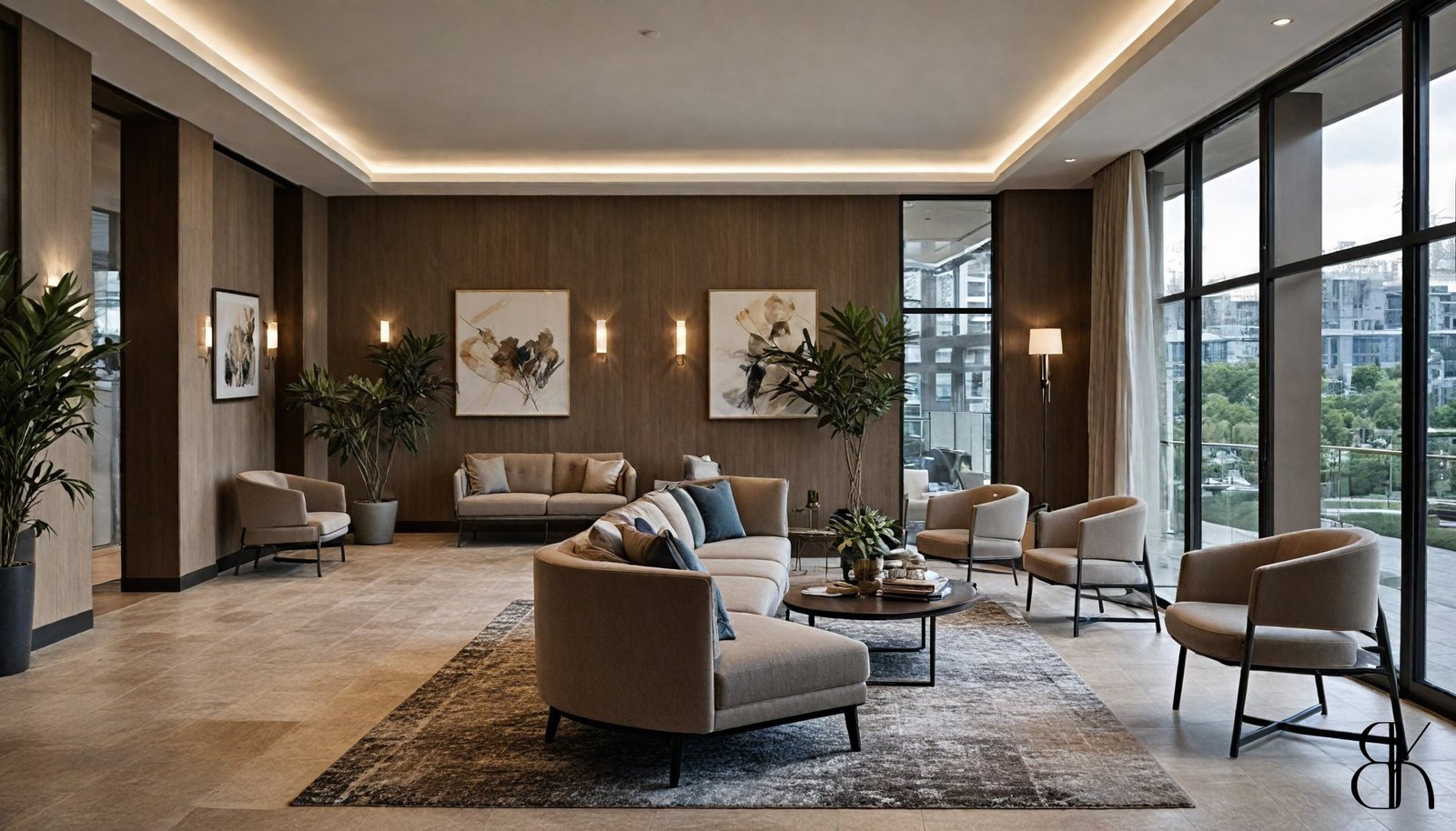 The close-up of the dark wood table adorned with black and gold decorations showcases the refined elegance of the space. The rich textures and colors evoke a sense of timeless luxury, blending modern classic design with subtle opulence. The elevator area, surrounded by lush plants and dark wood, adds a touch of nature to the luxurious setting. This blend of natural elements and sophisticated design creates a harmonious balance, enhancing the overall feeling of serene elegance in the hotel. The dark wood and gold accents provide a cohesive look, tying together the modern classic aesthetic throughout the lobby.